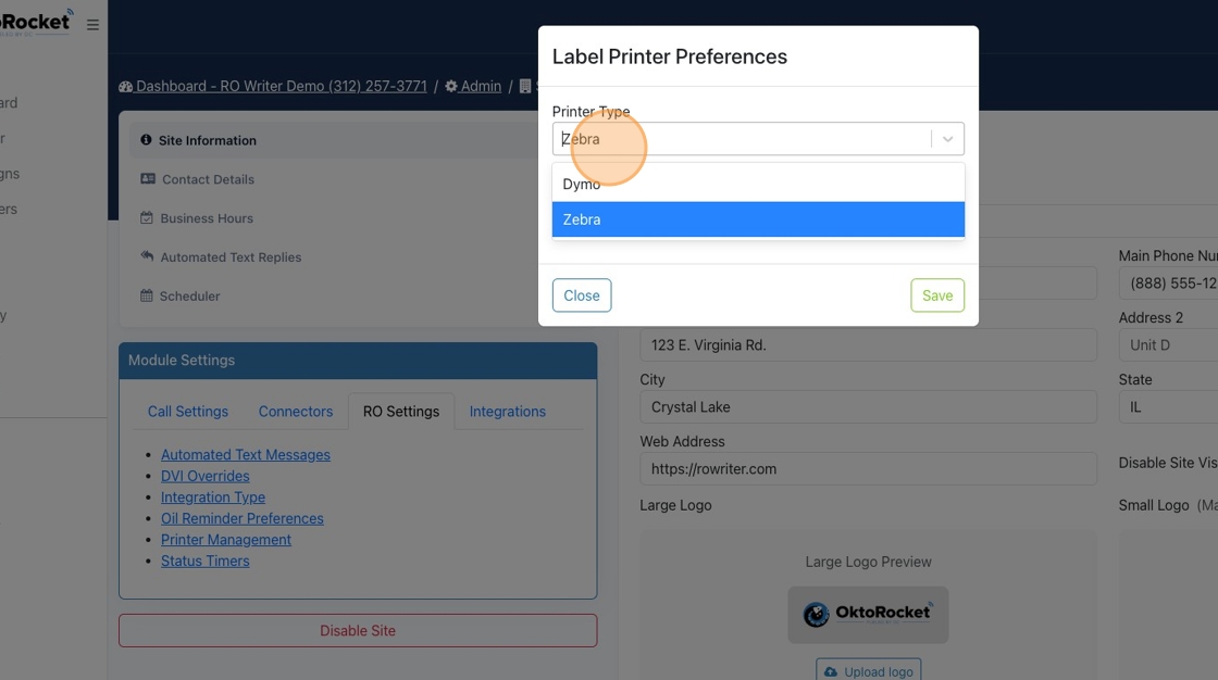 4. First, you'll want to select your printer type. Zebra is the most current. We do support some of the older Dymos.